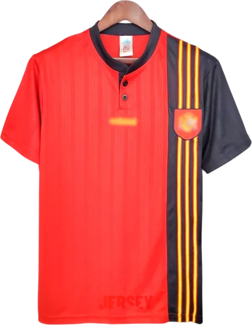 Lava en ciclo delicado con agua fría; conserva colores, costuras y escudo auténtico de camiseta de la selección española 1996 1997.