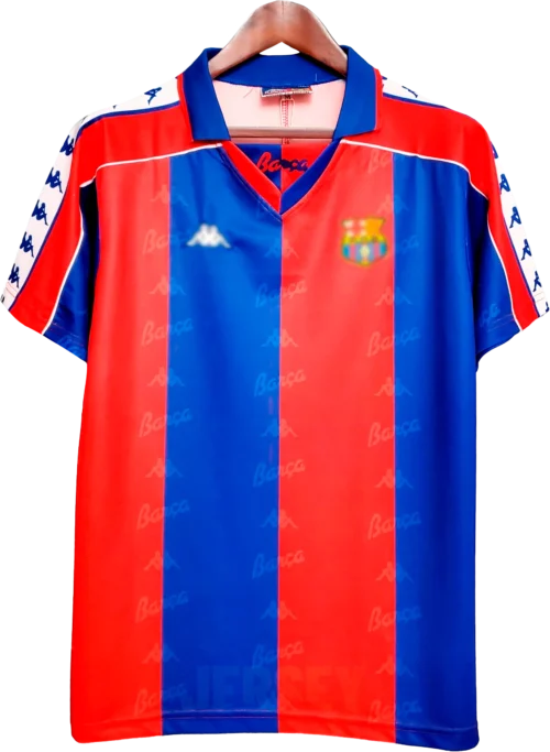 Lava en ciclo delicado con agua fría; conserva colores, costuras y escudo auténtico de camiseta del barcelona 1993.