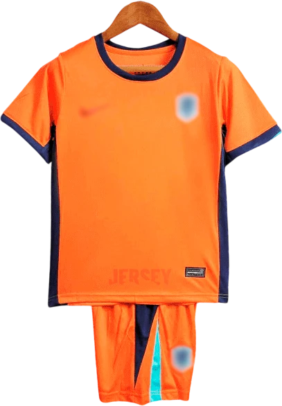 Se ve bien la equipación de la selección holandesa 2024 versión infantil puesta y combina fácil. Para mi gusto, el cuello algo abierto. Nada que impida recomendarla.