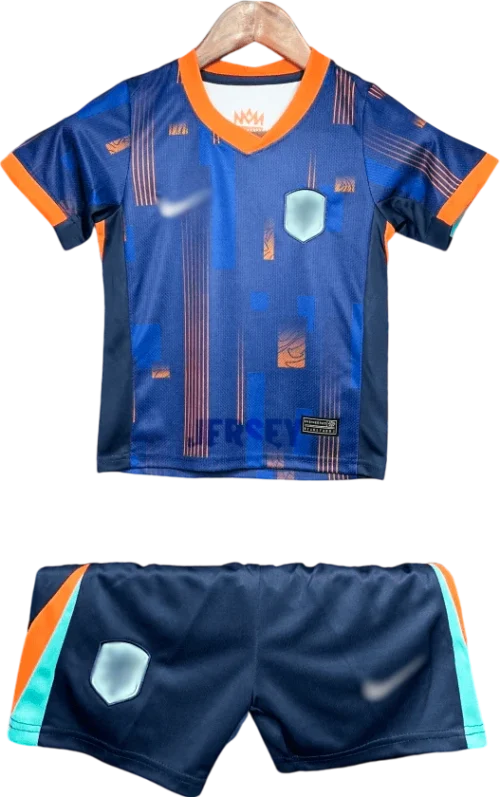 Lava en ciclo delicado con agua fría; conserva colores, costuras y escudo auténtico de camiseta de holanda 2024 visitante versión infantil.