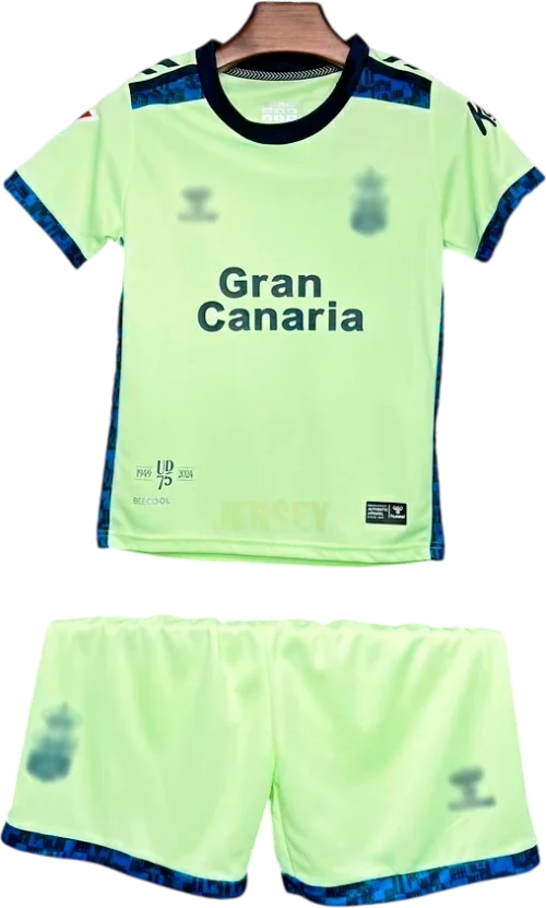 Lava en ciclo delicado con agua fría; conserva colores, costuras y escudo auténtico de camiseta ud las palmas 2024 2025 versión infantil tercera.